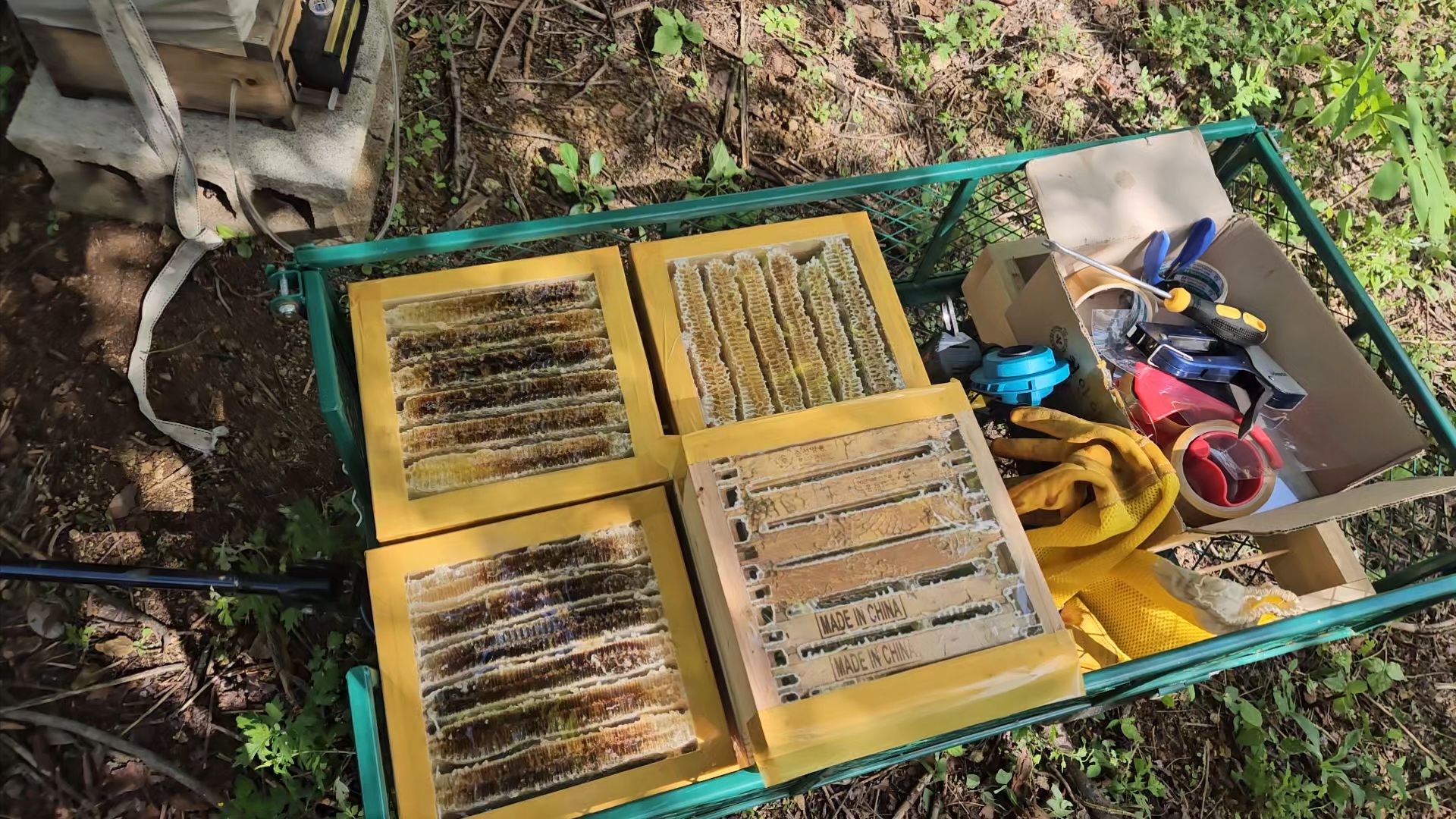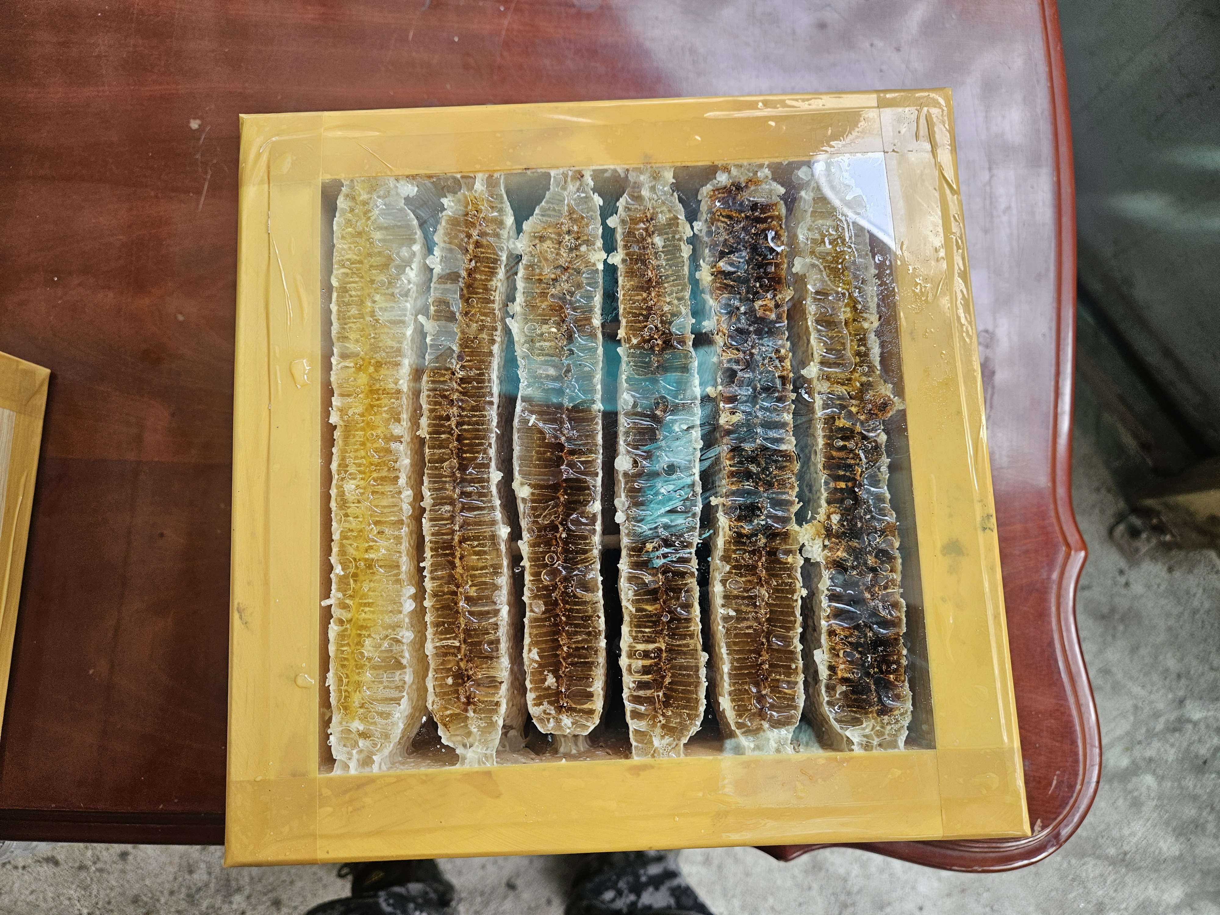 반쪽 소비가 들어간 통은 몇 통 안 되는데 세 칸씩 잘라내고 소비를 잘라 넣은 통은 두 칸씩 잘라서 인공밀랍 있는 부분은 모두 잘라냈고 천연밀랍이 있는 곳부터 사양벌집꿀로 판매됩니다.