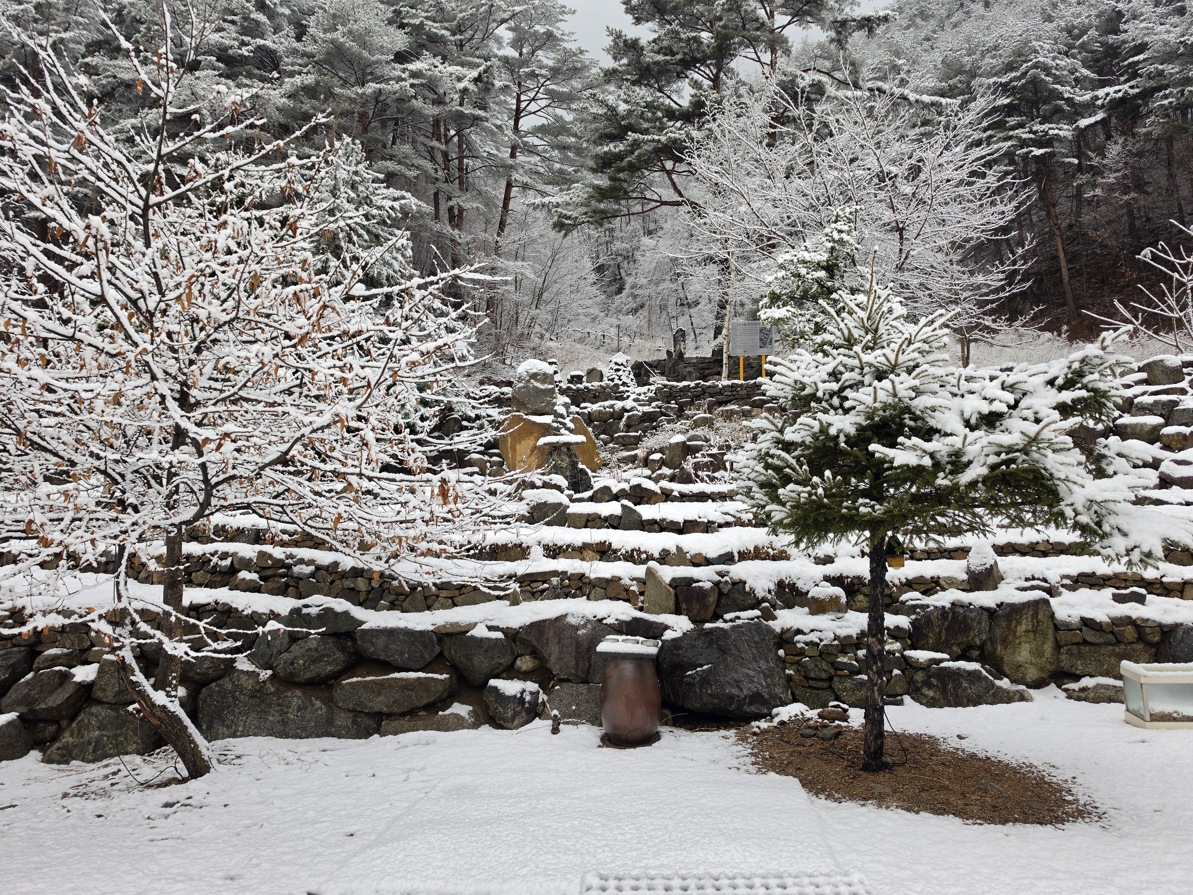간밤에 내린 눈으로 골짜구니 천존지당이 하얀 옷을 갈아입었다.